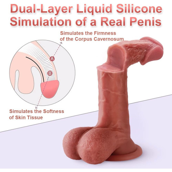 8.26 Inch Dual Density Silicone Dildo for Women and MenFlesh color, soft touch and emulational details make up this hyper-real dildo. It features a conical glans, raised blood vessels, a soft pe-nis shaft and 3D full shaped testicles.This is a perfect replacement for a normal sized man or used as a perfect anal dildo. Perfect for beginners, but also for advanced users.Incredibly flexible and bendable for any angleThe long shaft design is incredibly flexible and bendable, allowing it to hold its shape at almost any stimulating angle to get to all those hard to reach places and seek out the most sensitive inner sweet spots in different angle.Soft and Flexible SiliconeThis dildo is made of dual-layer liquid silicone, which is body-safe and soft to touch. Due to its flexibility, it can be bent to any angle. You can ride it up and down or shake it back and forth without pain.Unique 3D TesticlesWhat sets this dildo apart from others is the fact that it comes with full 3D balls that are well crafted to highly simulate male pe-nis. This will give you the most real sex experience.Soft Conical GlansTapered glans design is adopted to better enter your secret area, dildo adult sex toys for anal sex and vaginal G spot. This large dildo can also be used for throat training or oral sex.Waterproof and Easy to CleanAs it is silicone design, the dildo cleans easily by thoroughly washing over with warm soapy water or use toy cleaner. After rinse off clean, pat it dry with a clean towel, then the dildo will be ready to store away until next use.Strong Suction CupThis dildo can be attached to most smooth, hard surfaces. If you dip a little water on the suction cup, it will stick more tightly than before. You can attach the flexible dildo to wall tiles for more hands-free play. Or put the dildo on the floor or chair, sit down and shake it to rub your inner canal. Even stick it on the bathroom tile and admire your expression in the mirror.Notice:Recommended to use water-based lubes only. Silicone-based lubes will cause dissolution reaction.In order to extend the service life of the product, please avoid putting the product together with other products to avoid melting.Please allow slight measurement deviation for the data.Material: 100% Liquid SiliconeTotal length: 8.2 inchInsertable length: 6.5 inchDiameter: 1.65 inchSuction cup diameter: 2.9 inchNet weight: 0.93 IbStyle: RealisticWater Resistance Level: 100% WaterproofProduct detailsPackage Dimensions : 8.82 x 4.92 x 3.11 inches; 1.08 Pounds